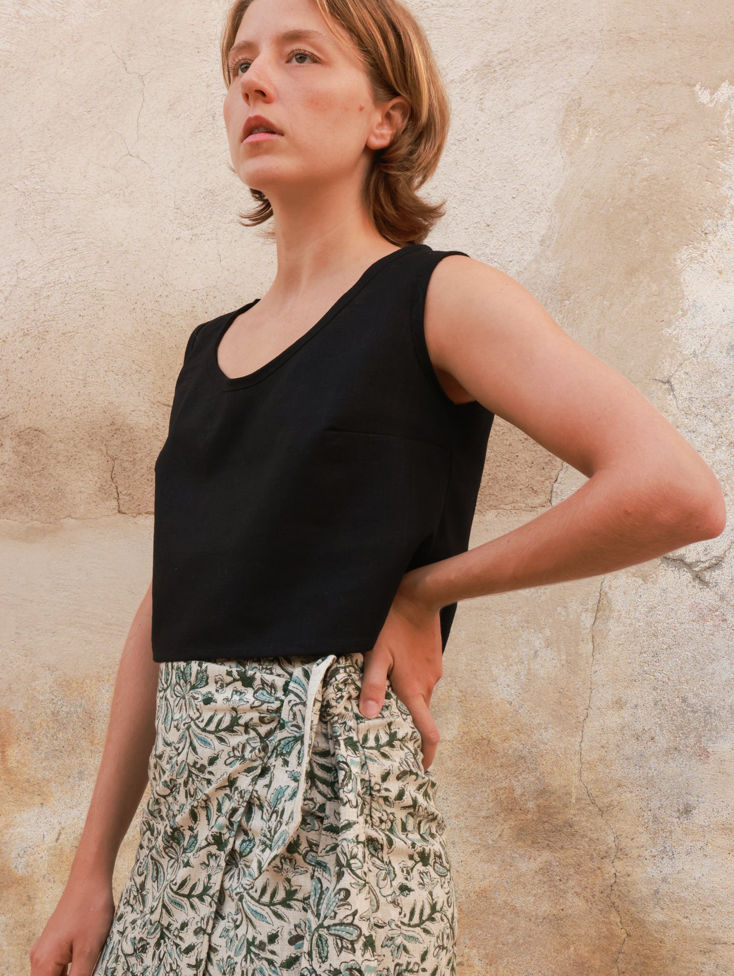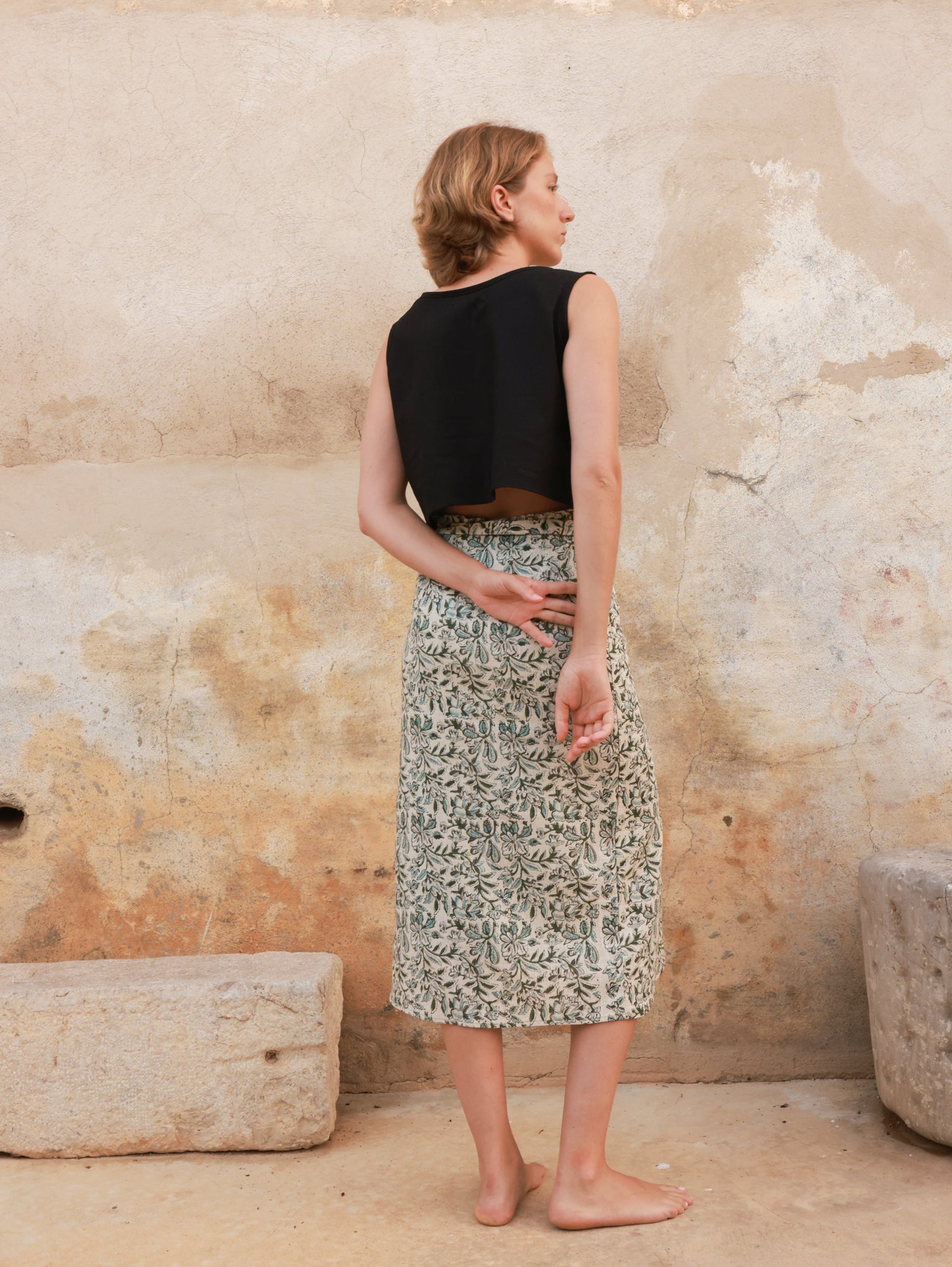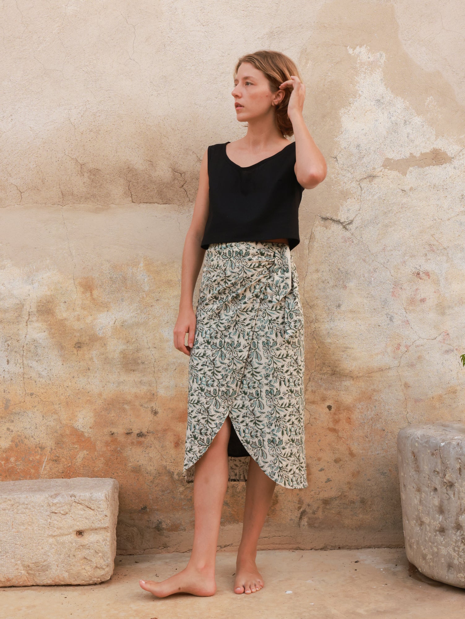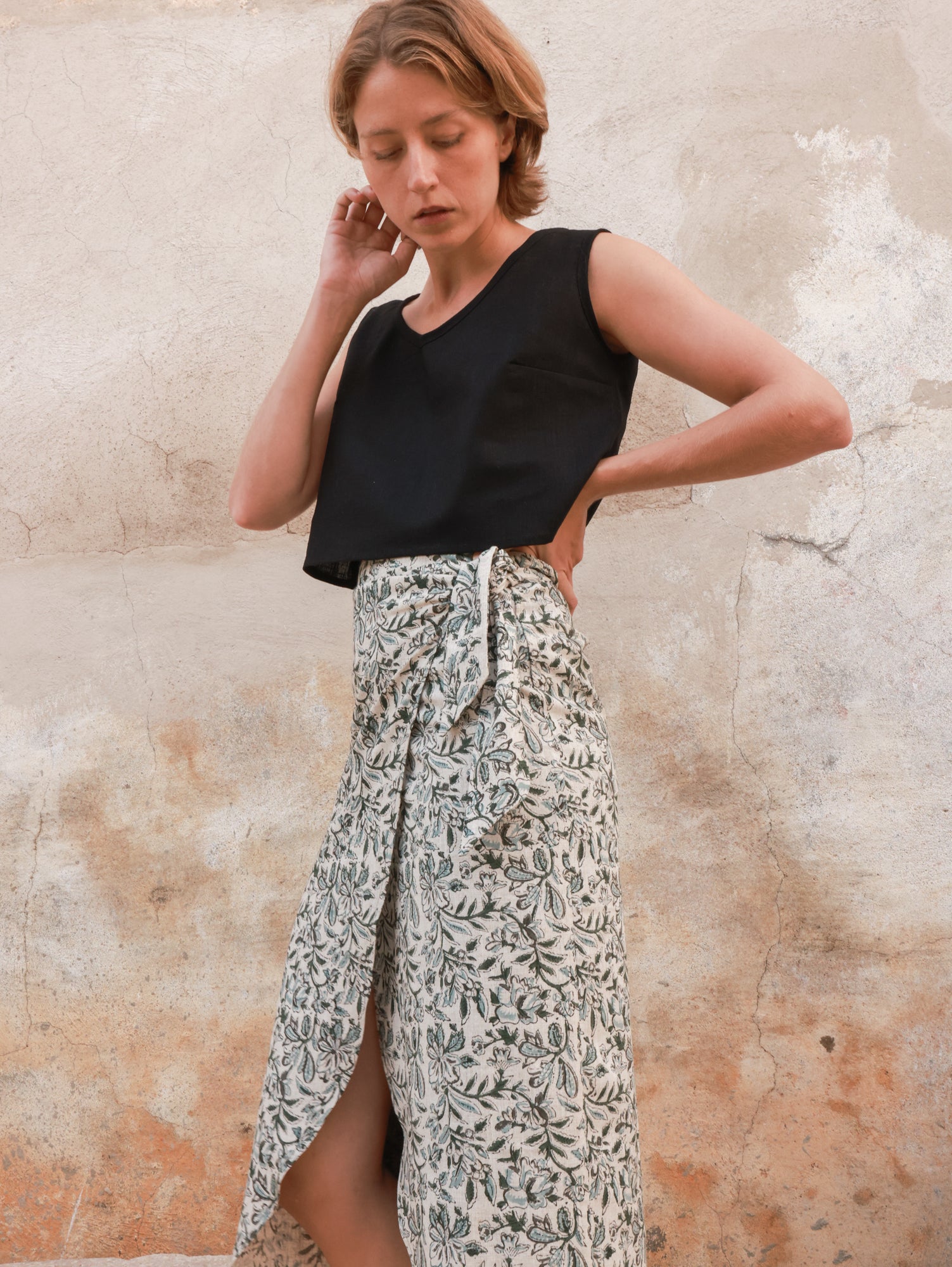 La falda Chez Otis tiene un diseño de estilo pareo, cruzado con hojal y cinta ajustable, que se adapta de forma natural a la cintura. Las costuras en la cadera definen suavemente la silueta, y un pequeño fruncido en la tira delantera añade un detalle sutil que eleva la prenda.