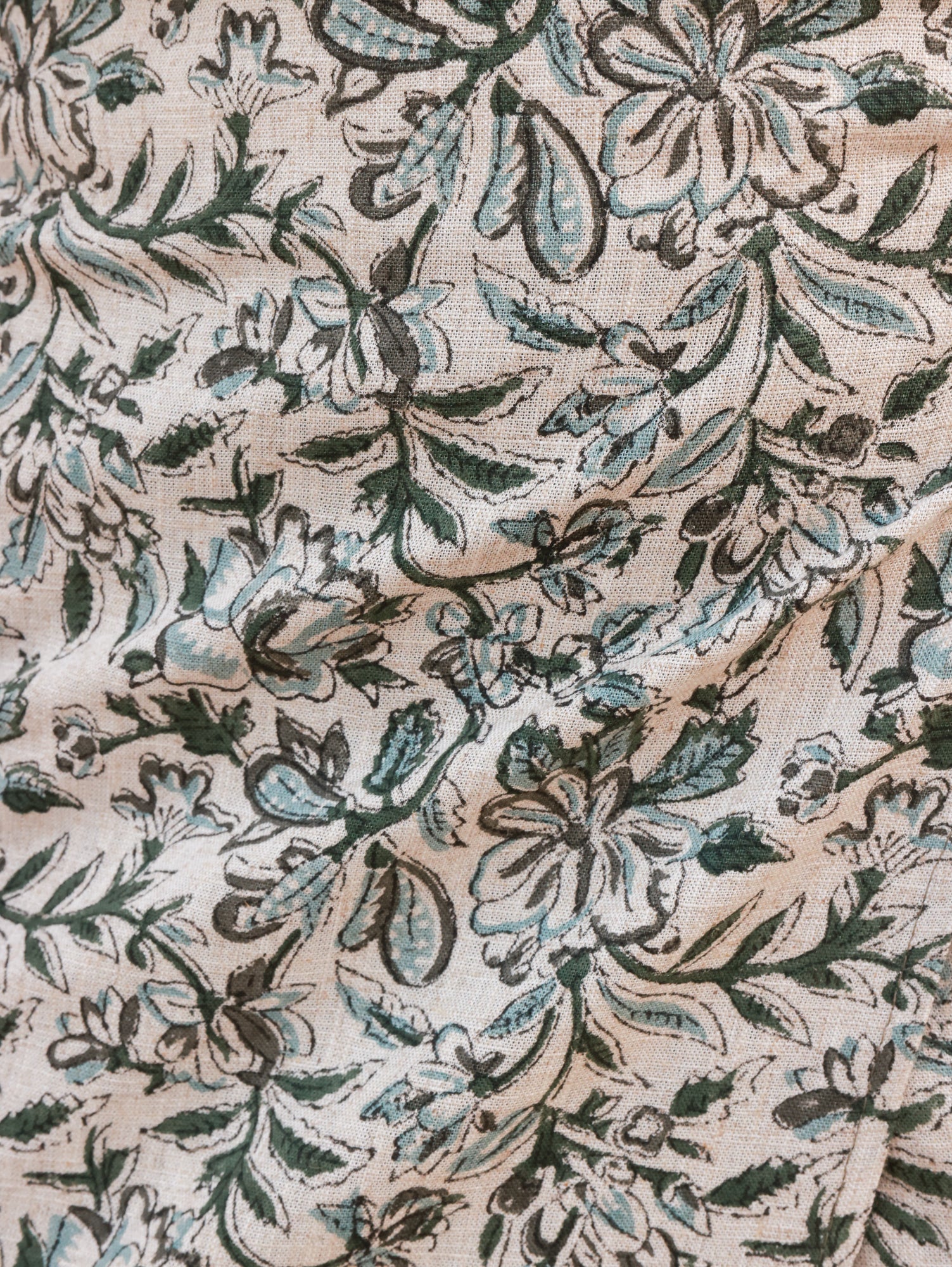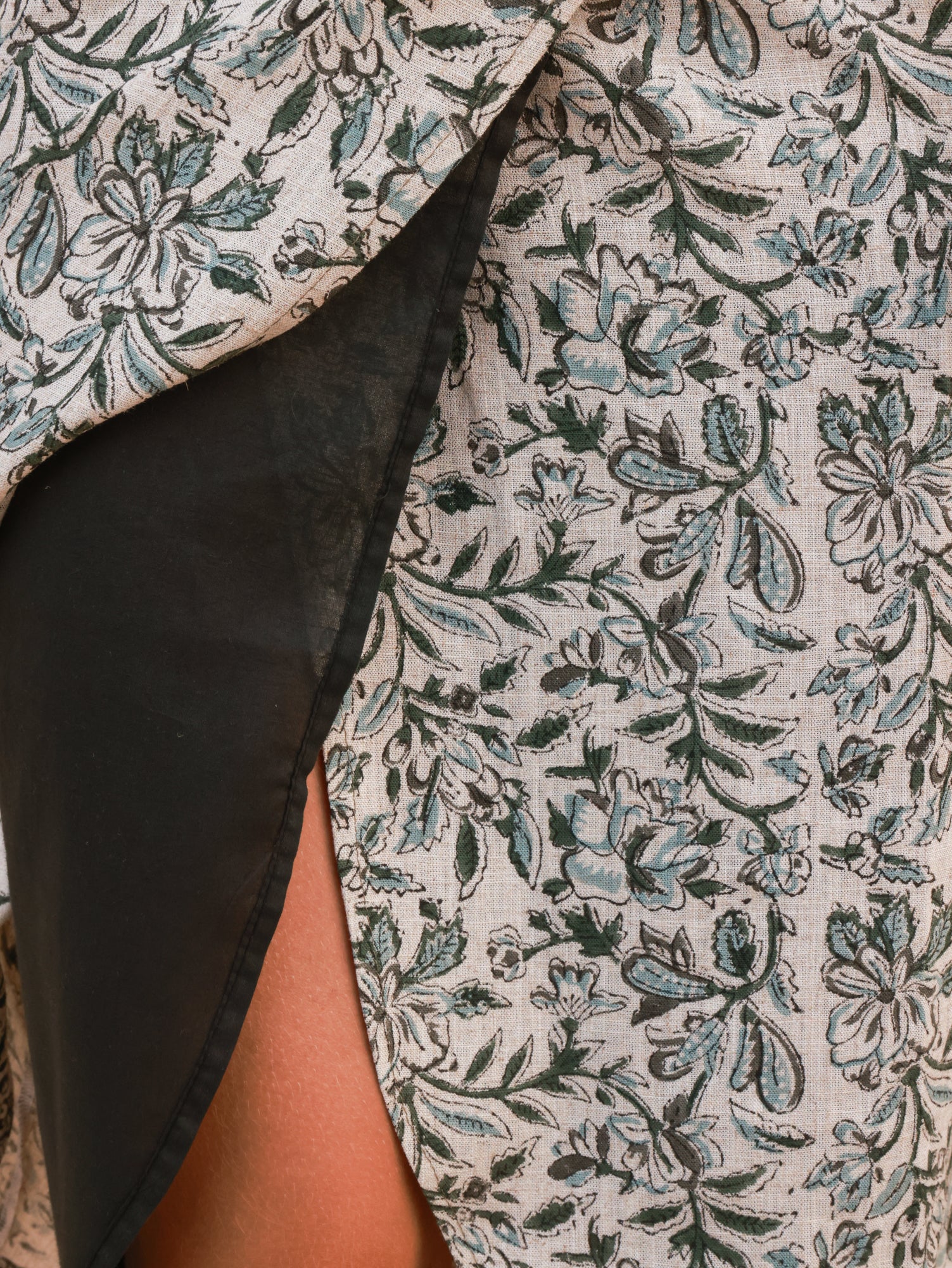 Confeccionada en 100% lino orgánico, cuenta con forro interior de algodón natural que aporta calidad y evita transparencias. Su tejido ligero y transpirable tiene un estampado floral sobre base blanca, con toques en morado intenso y verde menta, que aporta frescura visual y armonía.