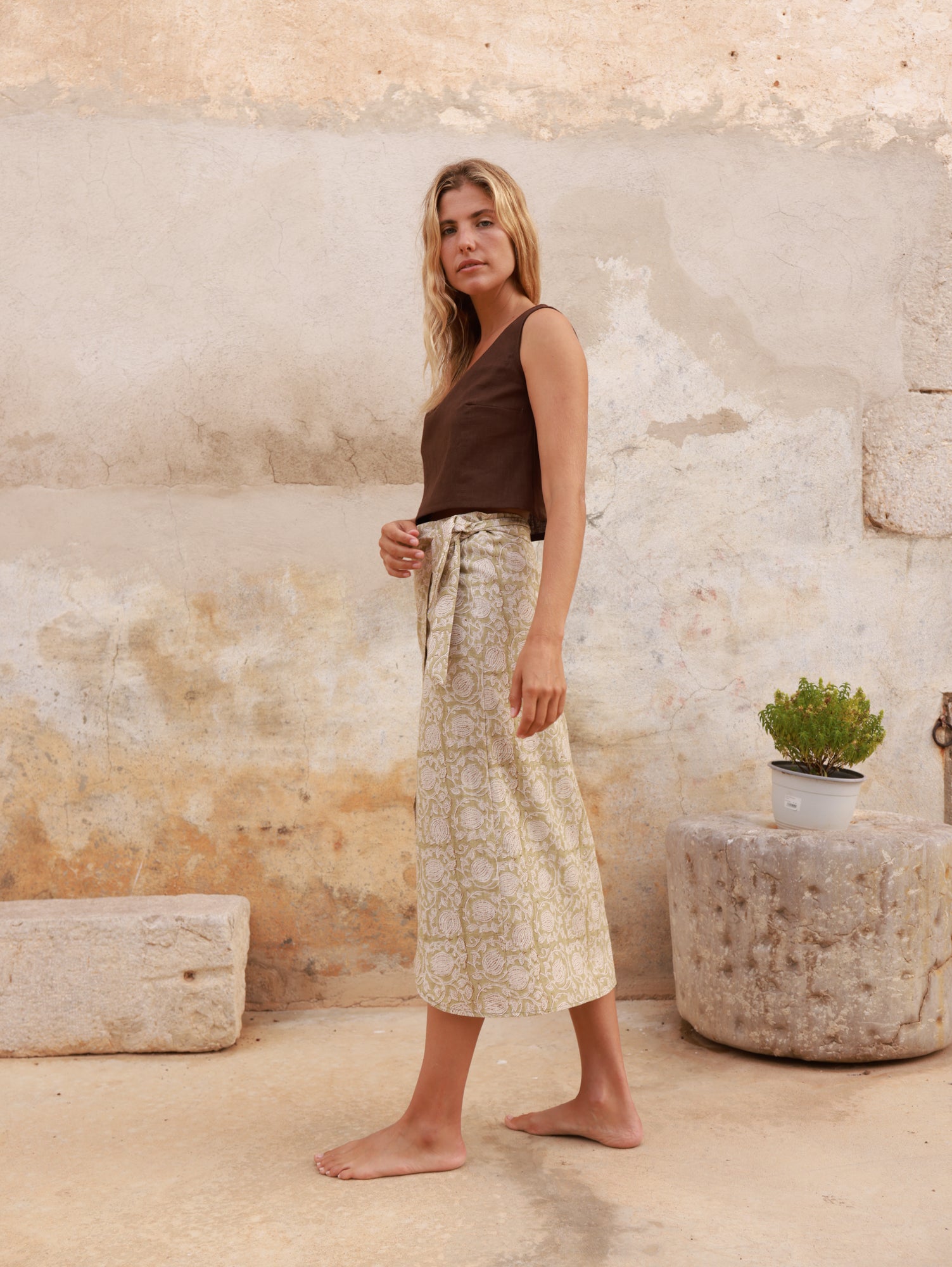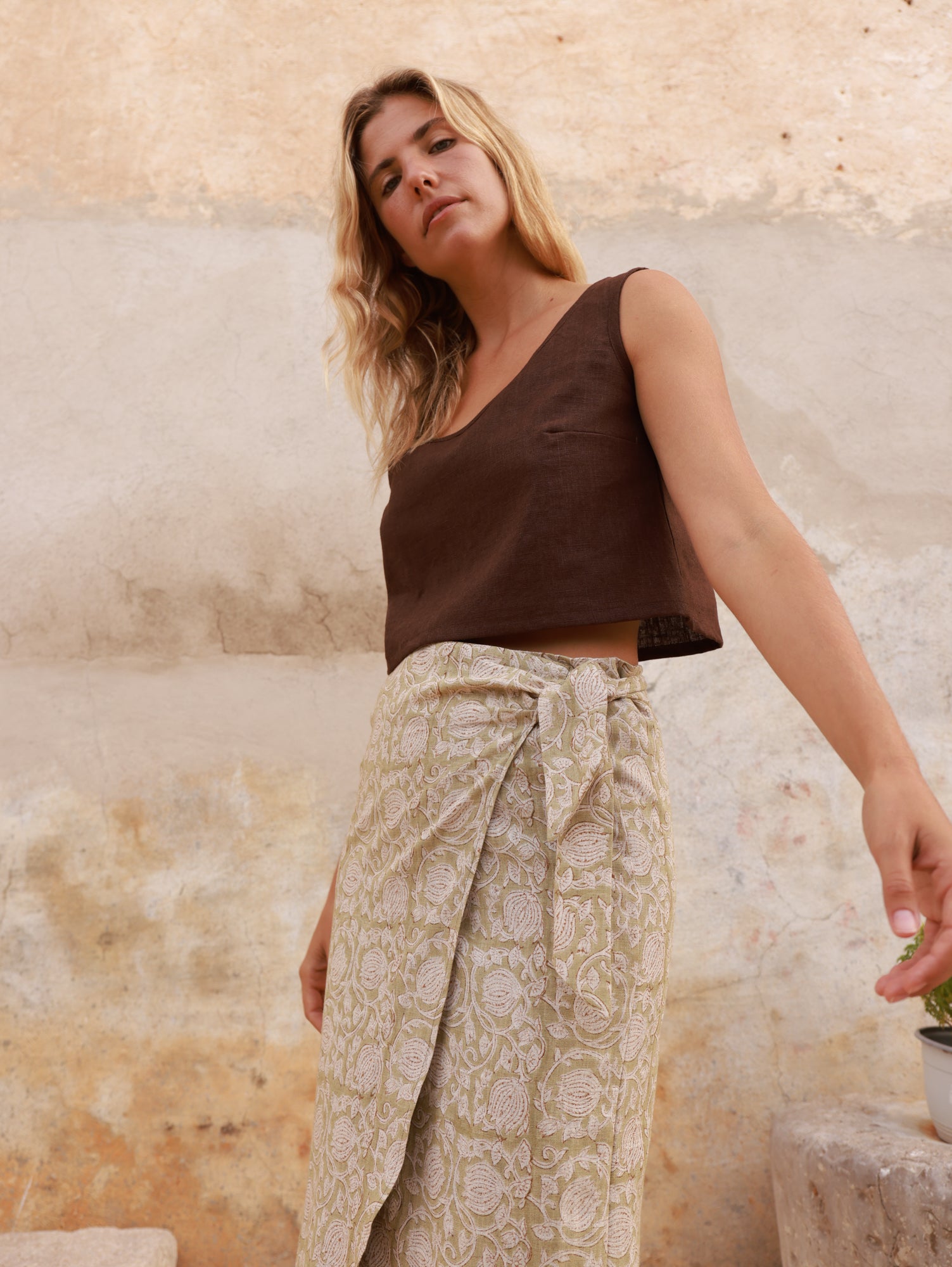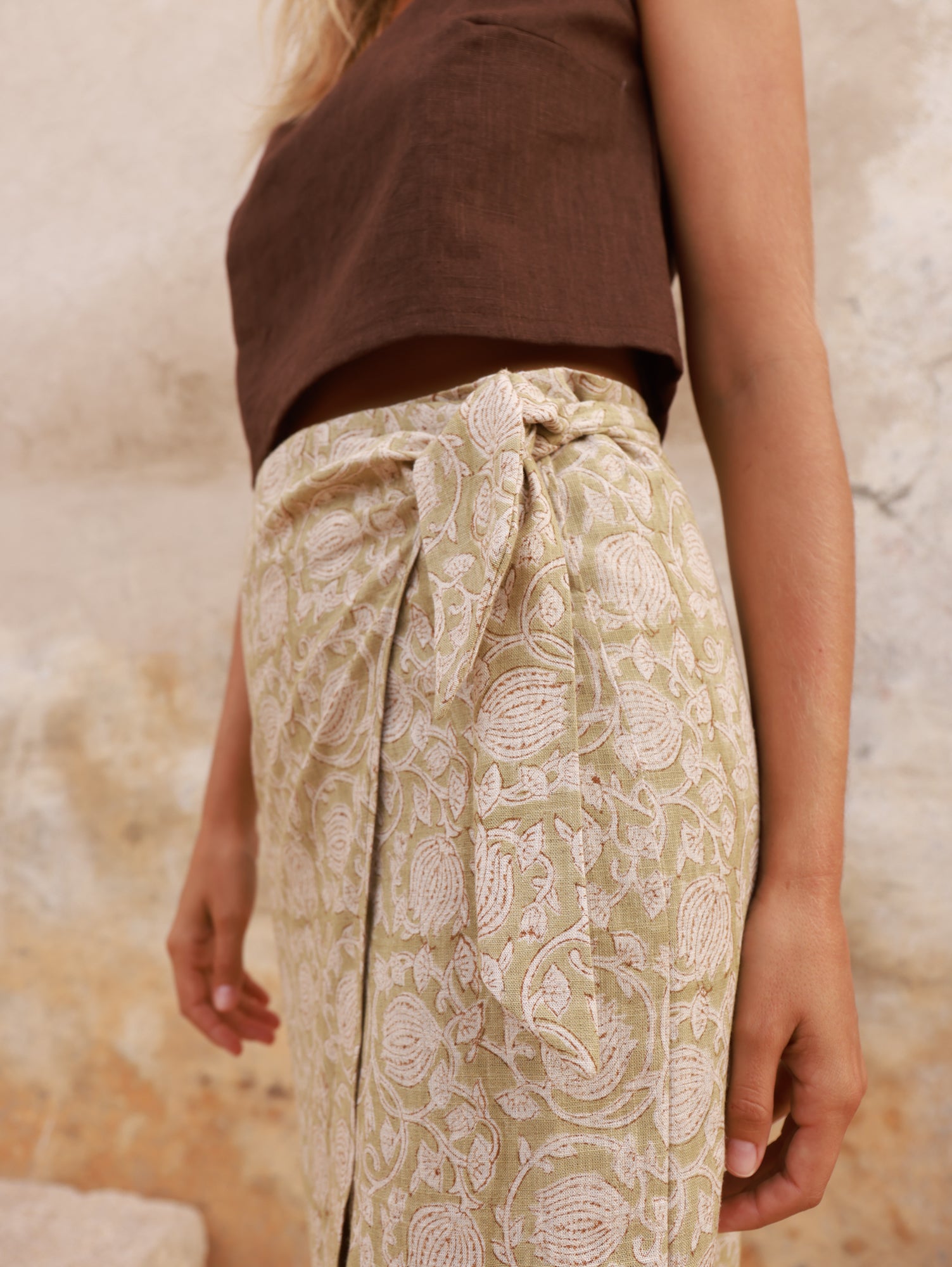 La falda Chez Otis tiene un diseño de estilo pareo, cruzado con hojal y cinta ajustable, que se adapta de forma natural a la cintura. Las costuras en la cadera definen suavemente la silueta, y un pequeño fruncido en la tira delantera añade un detalle sutil que eleva la prenda.
