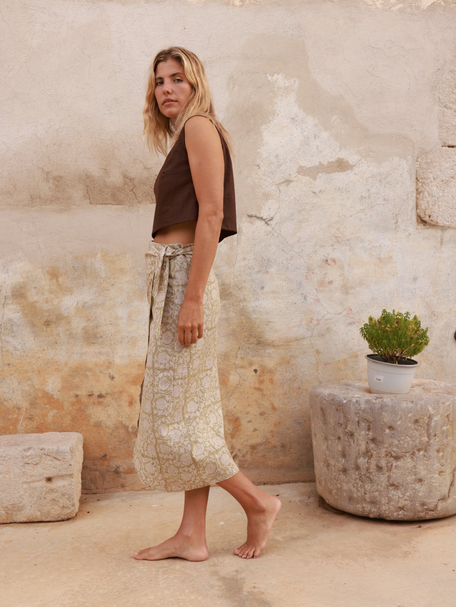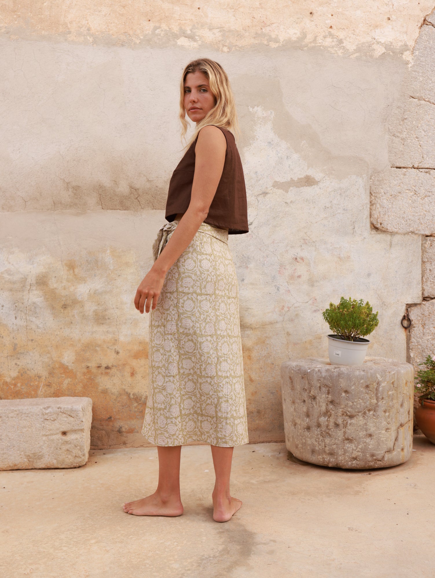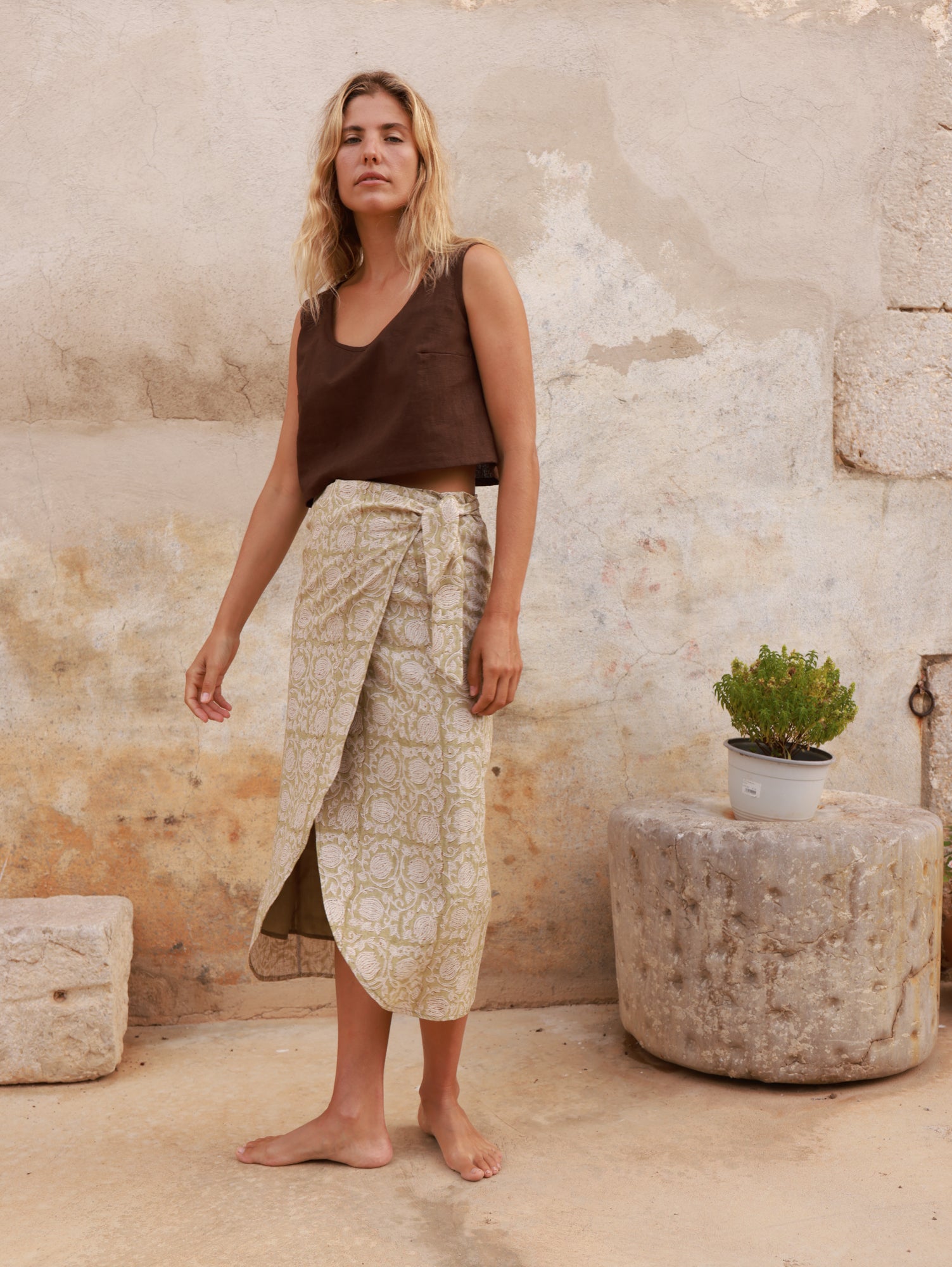La falda Chez Otis tiene un diseño de estilo pareo, cruzado con hojal y cinta ajustable, que se adapta de forma natural a la cintura. Las costuras en la cadera definen suavemente la silueta, y un pequeño fruncido en la tira delantera añade un detalle sutil que eleva la prenda.