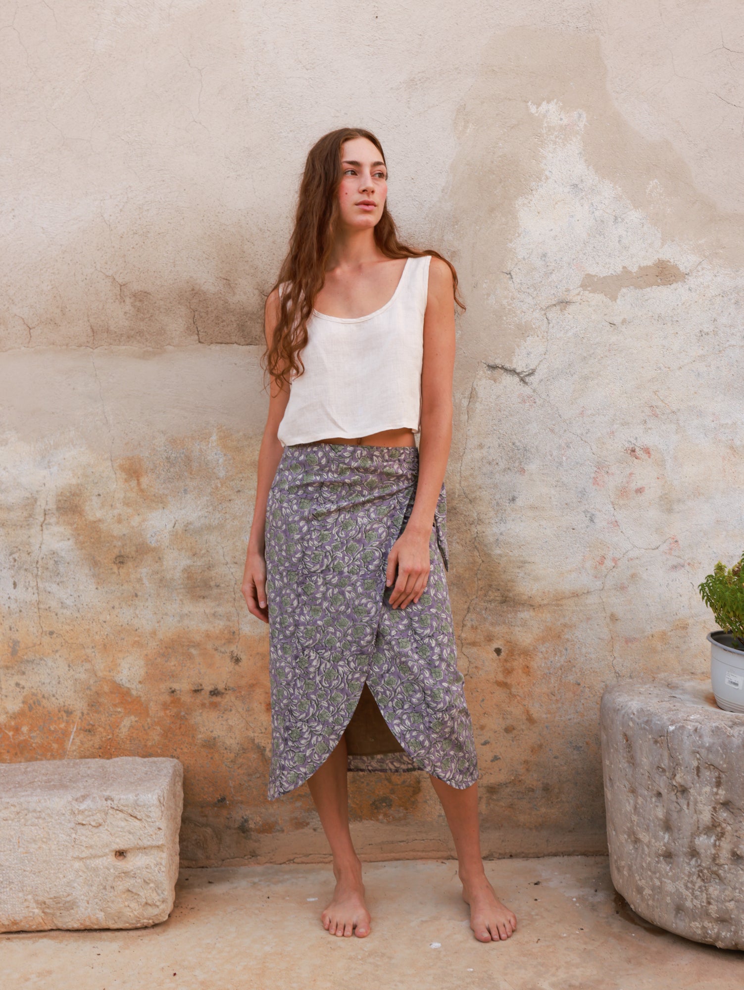 La falda Chez Otis tiene un diseño de estilo pareo, cruzado con hojal y cinta ajustable, que se adapta de forma natural a la cintura. Las costuras en la cadera definen suavemente la silueta, y un pequeño fruncido en la tira delantera añade un detalle sutil que eleva la prenda.