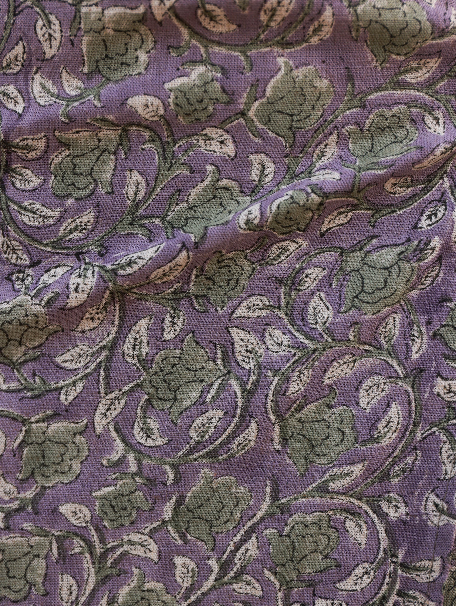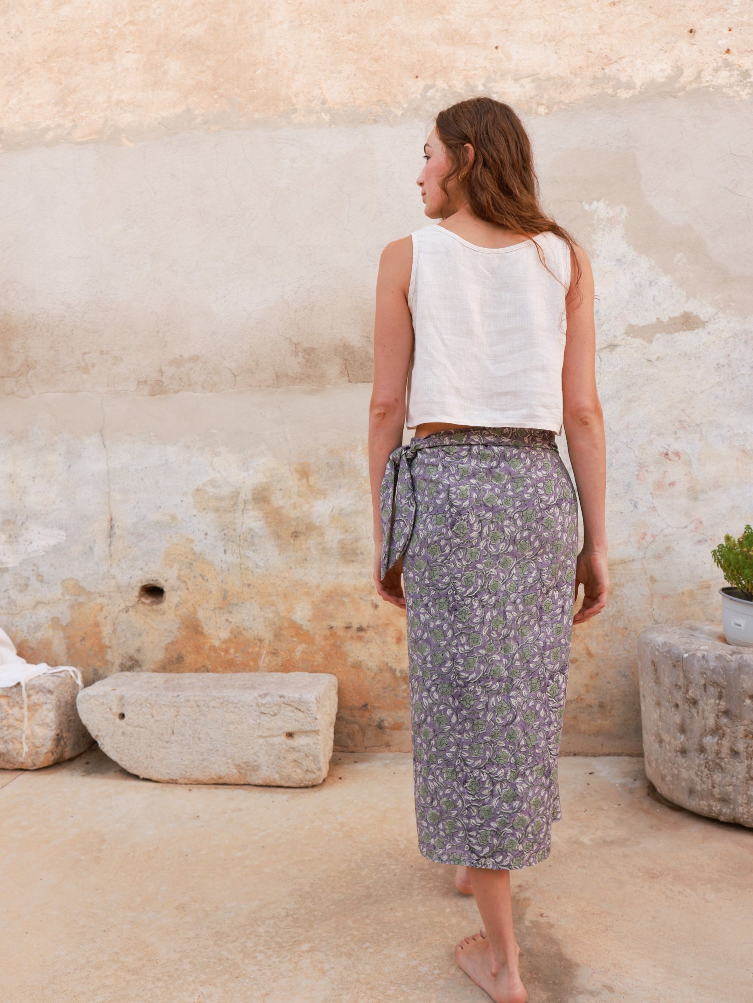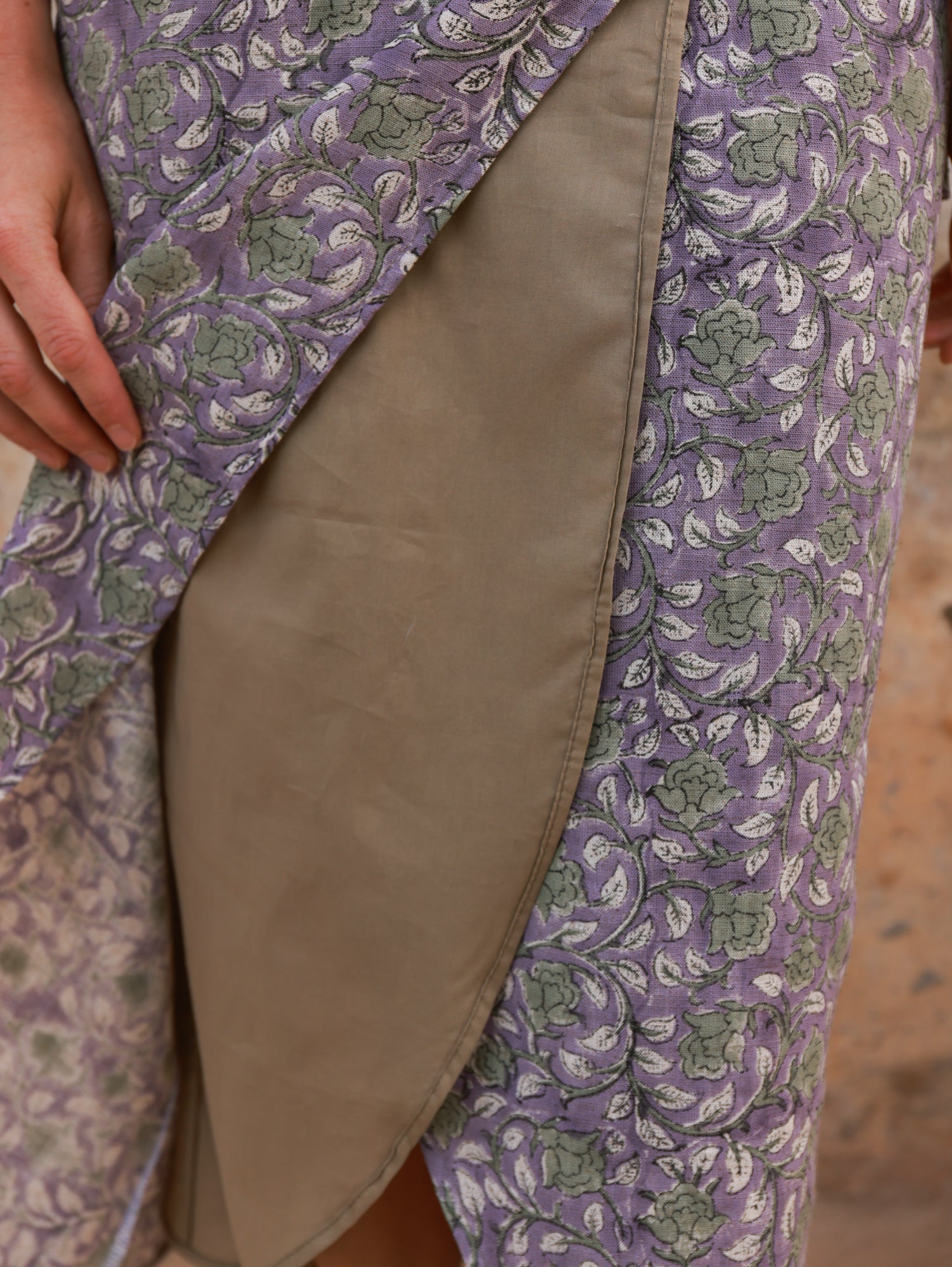 Confeccionada en 100% lino orgánico, cuenta con forro interior de algodón natural que aporta calidad y evita transparencias. Su tejido ligero y transpirable tiene un estampado floral sobre base blanca, con toques en morado intenso y verde menta, que aporta frescura visual y armonía.