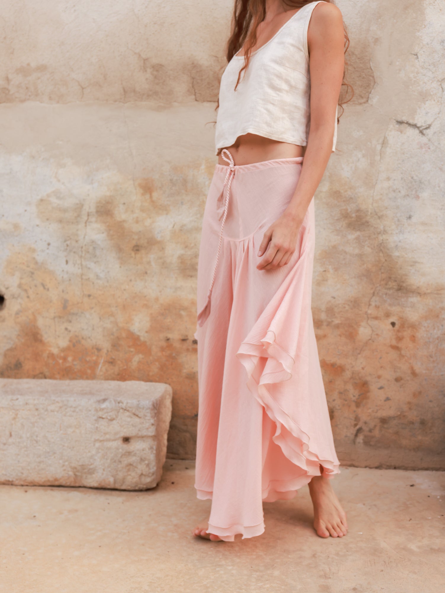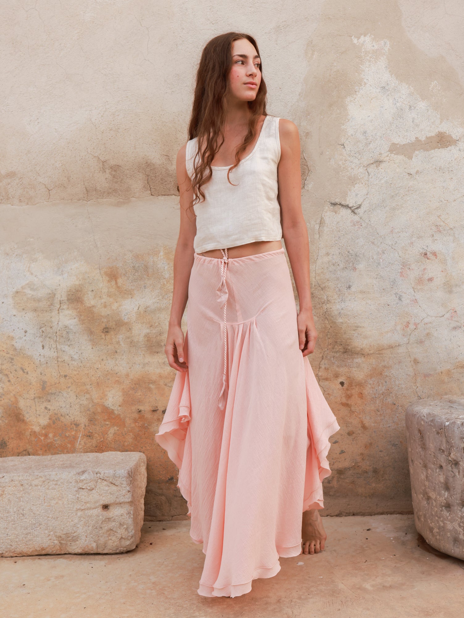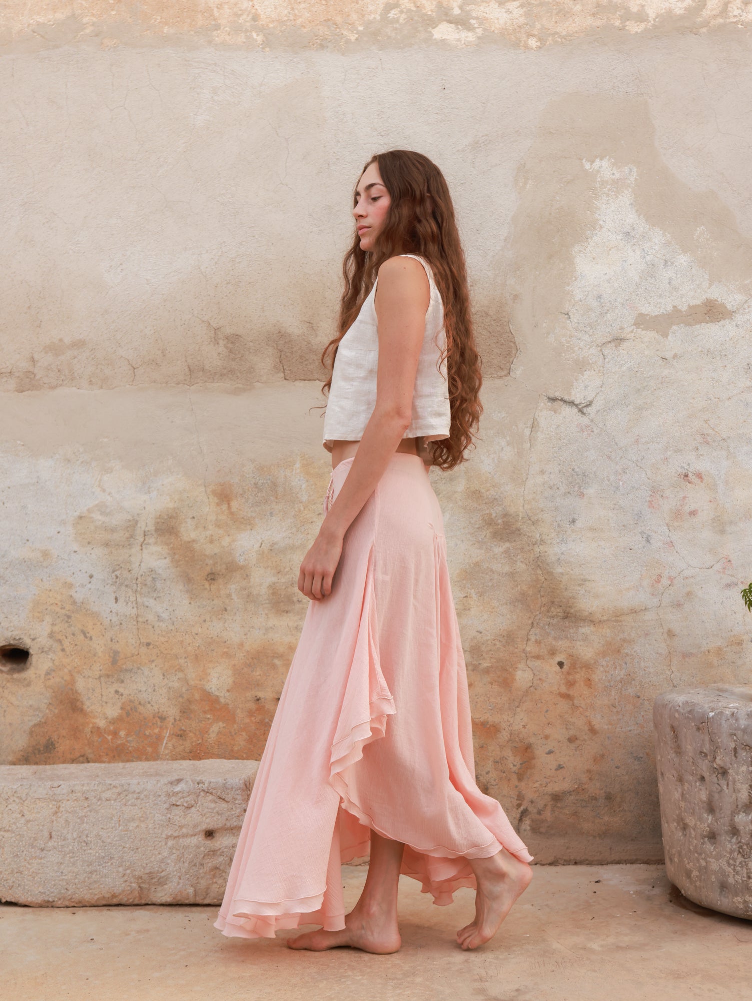 Margot es una falda maxi confeccionada en un suave tejido de algodón, pensada para acompañarte con movimiento y elegancia.