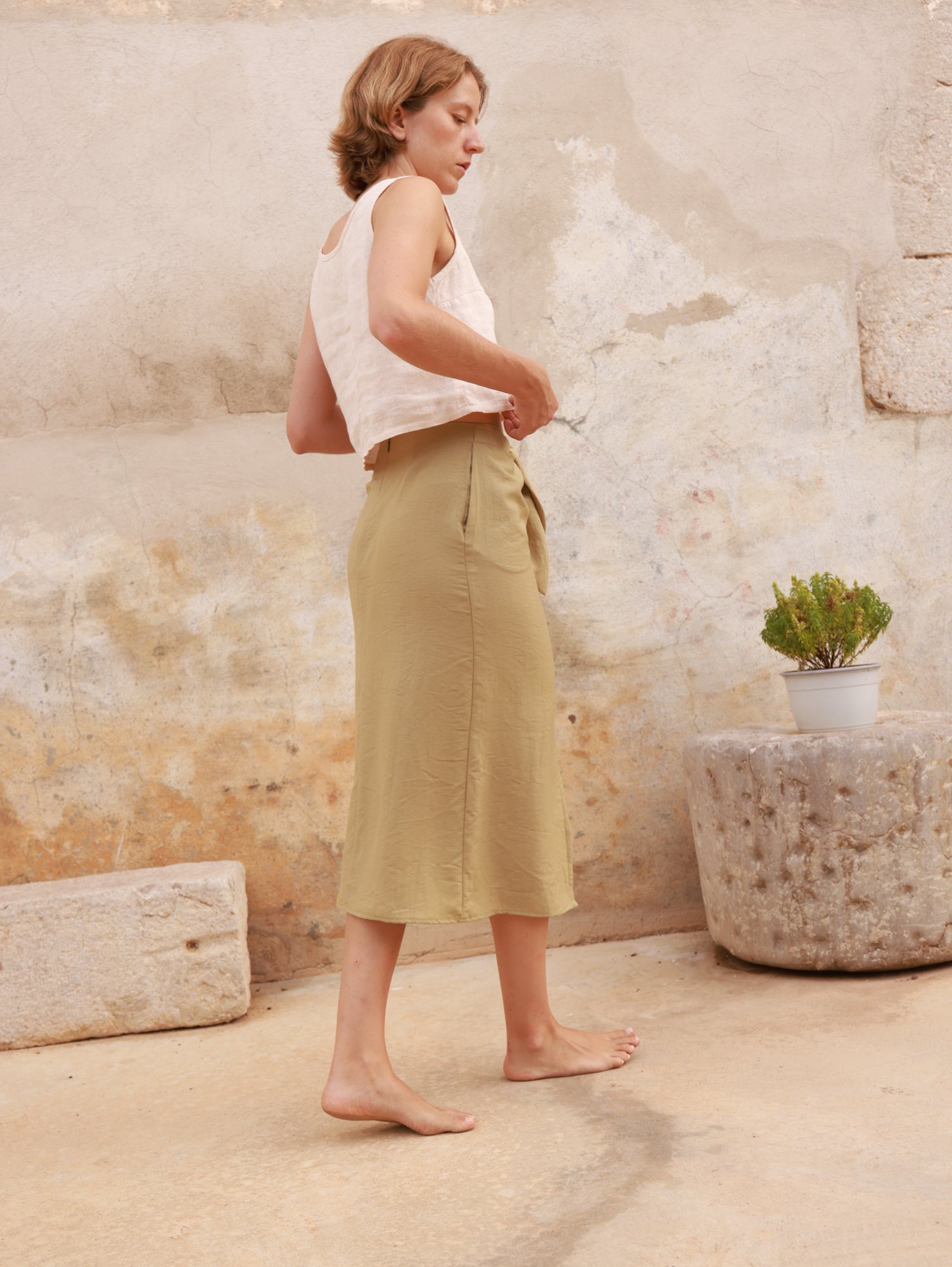 La falda Namba tiene un nudo delantero con lazada que añade un detalle único al diseño. De largo midi y en un tono aceituna, combina textura y color para crear una prenda versátil.
